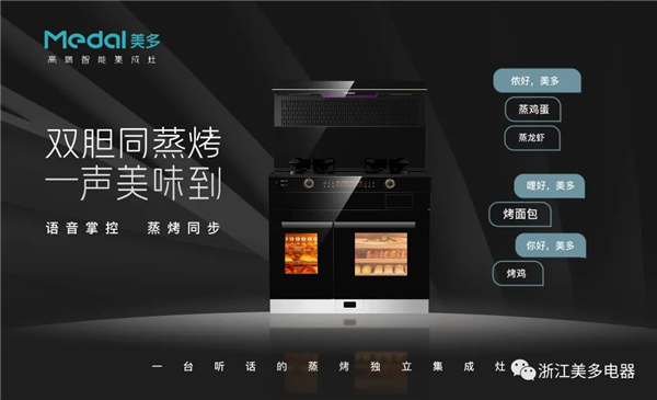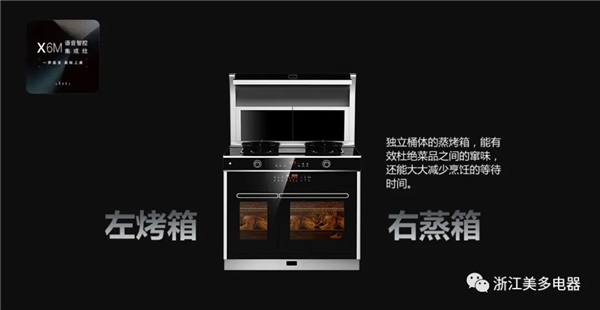 蒸烤箱方面,美多语音分蒸烤集成灶也做了很大的改变。突破传统蒸烤一体机的结构,黄金比例分割成30L的左烤箱和46L的右蒸箱,蒸烤独立分区,不仅省时高效,还能保障不同菜肴之间不会串味。