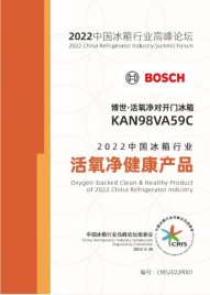 博世·活氧净对开门冰箱KAN98VA59C荣获“2022中国冰箱行业活氧净健康产品”