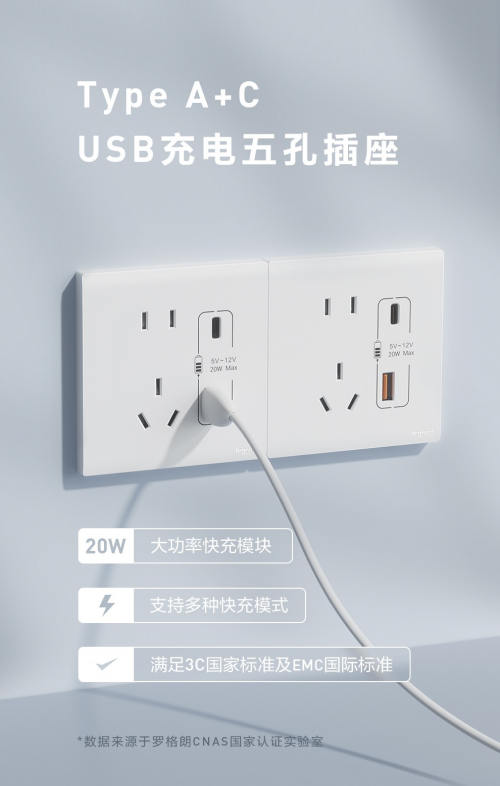 现代生活中人人手机不离身,电量时常告急。罗格朗紧跟时下插座的新潮流,推出了Type A+C USB充电五孔插座,20W大功率快充模块,解决了传统面板没有USB接口的问题,无需插头,一线即可马上接电,方便手机时时在线。