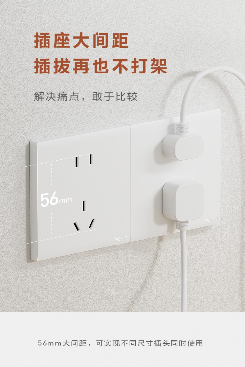 简悦系列插座解决痛点,敢于比较,创新实现了56mm的大间距,可以同时使用不同尺寸的插头,两个插头再也不会“打架”,人性化设计成为了本次新品的最大亮点。厨房区域常用的带开关插座,大间距五孔插座搭配大按键开关,无需反复插拔插头,一键通断更加安全省心。