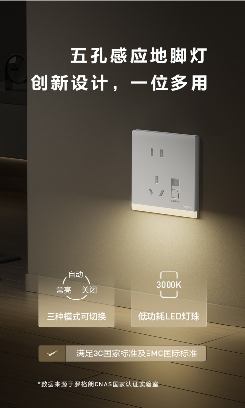 值得一提的还有五孔感应地脚灯,它是一款集多种功能为一体的电子产品。创新贴心设计,有自动、常亮、关闭三种模式可切换,不仅可以用于夜间人体感应照明,还可以当作五孔插座使用,让地脚灯这类产品变得不再“鸡肋”。