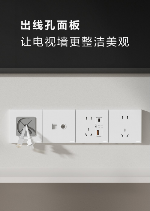 电视墙上一大堆线,乱成一团,不仅看上去杂乱不美观,还有可能会影响到好心情。出线孔面板和其他面板一起联排安装,出线整洁有序,告别杂乱,为电视墙提供更加整洁美观的用电解决方案,让美好生活无杂紊。