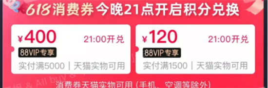 众所周知,每年的双11和618淘宝系都会给88VIP会员送上大额满减券,主要被用户用在手机或其他大型家电上,甚至有用户在咸鱼进行券交易。但是在26日晚,淘宝针对88VIP发布的优惠券,需要用积分进行兑换,并且,券不支持购买手机和空调等,还要求实付,目前尚不清楚今年阿里系大力鼓吹的各种形式和品牌的购物金是否算实付范围。