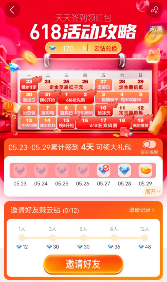 但是,目前苏宁也没有像往年一样开启每日小游戏得红包的活动,但是发布了活动日程。签到方面也比较小气,拉人头甚至只发云钻。