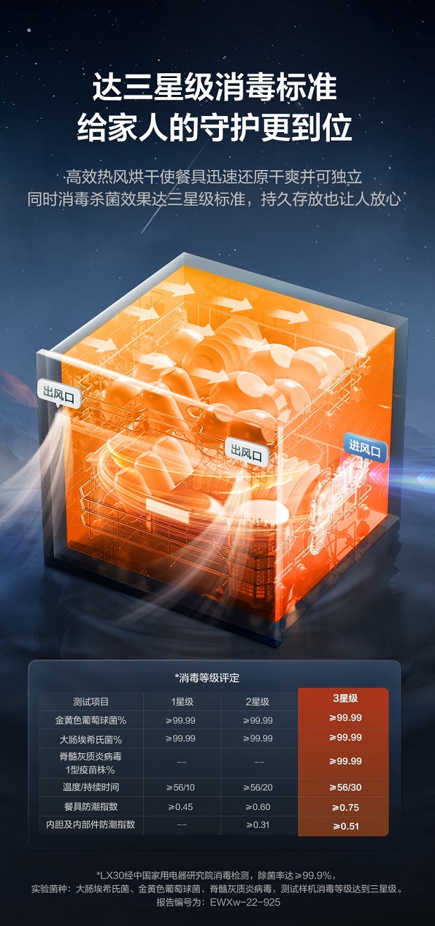 与此同时,在洗涤过程中,其能够释放银离子,深度抑制细菌滋生,有效祛除内腔异味,并且它还获得了三星消毒认证,通过高效热风烘干+72H循环换气存储,让餐具持久清新,时刻守护家人饮食健康。