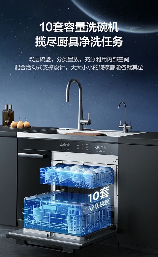 为了解放用户双手,美的集成水槽净洗机LX30搭载双层喷臂配合29kPa水压,全方位清洁碗碟油污,并以72℃高温煮洗,有效溶解附着在碗筷上的顽固油脂,让你轻松解决碗碟清洁难题。同时它可以容纳10套容量清洗,并且支持双层碗篮,分类置放,充分利用内部空间,专业收纳让餐具都能各就其位,完全满足大家庭和家庭聚餐饮食生活需求。