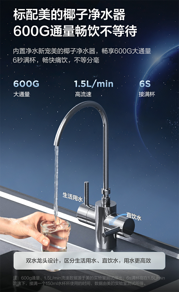 此外,它具备600G大通量,采用双水龙头设计,高效区分生活用水、直饮水,以及1.5L/min的高流速,6秒即可接满杯,让用户健康畅饮无需等待。