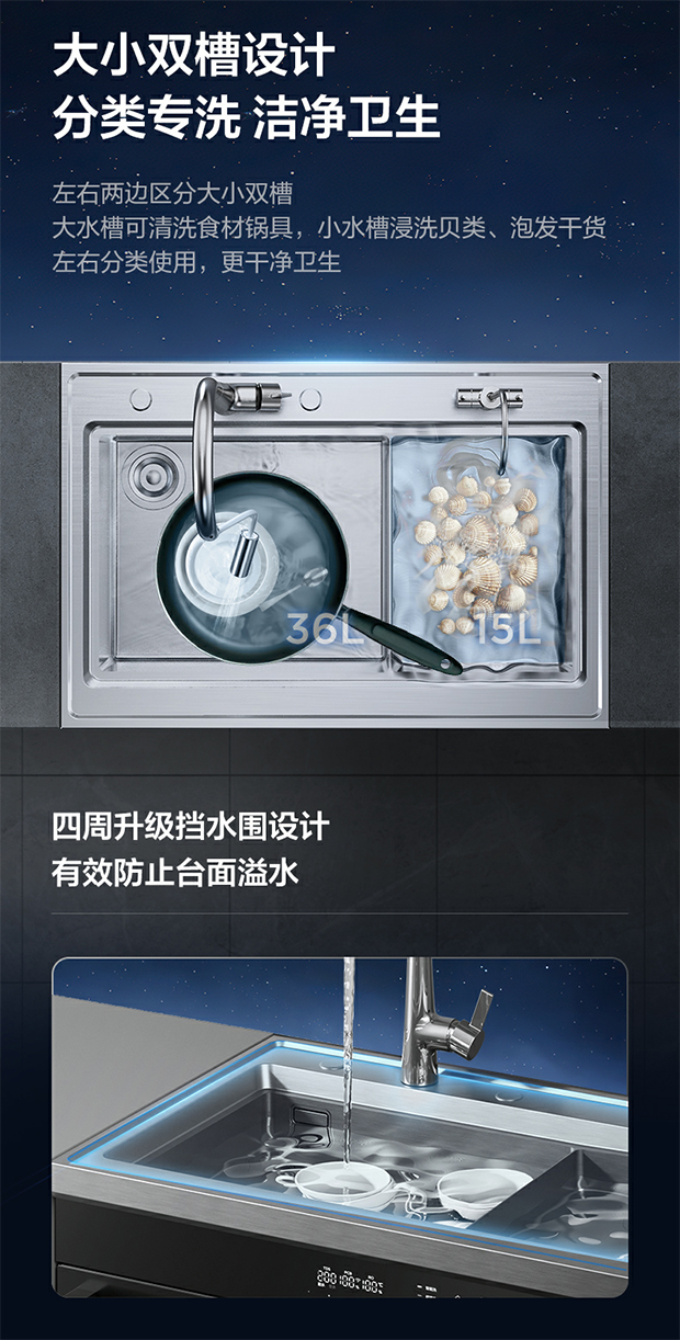 美的集成水槽净洗机LX30,采用大小双水槽设计,容量分别为36L和15L,大水槽可清洗食材锅具等大件物品,小水槽则可以浸泡贝类、泡发干货等小食材,左右分类明晰,方便用户分类清洁,更加干净卫生。不仅如此,其配备的砧板,可以直接放在小水槽上面,当作置物空间,既节省空间,也更贴心实用。另外,其水槽四周升级了挡水围,有效防止台面溢水,同时还配有抽拉回弹式龙头,让水槽边角清洗更轻松,方便用户多场景使用。