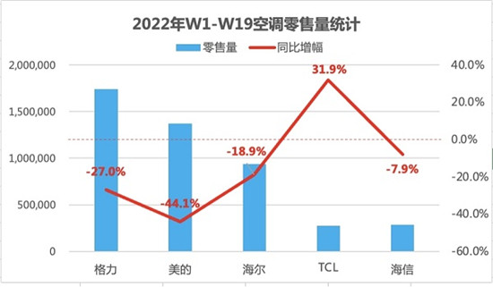 据中怡康线上+线下空调周度监测报告显示,截止2022年5月8日,2022年中国空调市场零售量排名前五的品牌中,格力、美的、海尔、海信均出现负增长,TCL空调成为销量前五的品牌中唯一实现增长的品牌,同比增长31.9%。