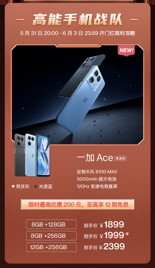 一加Ace竞速版,将在5月31日晚8点正式开售。作为2000元价位性能全面满血、续航超级能扛、基础体验不妥协的真香机,一加Ace竞速版搭载独家定制的天玑8100-MAX处理器,标配LPDDR5和UFS3.1,最高12GB+256GB存储版本,带来流畅游戏体验。搭载金刚石8层散热系统,极速散热,给足夏日冰爽体验。