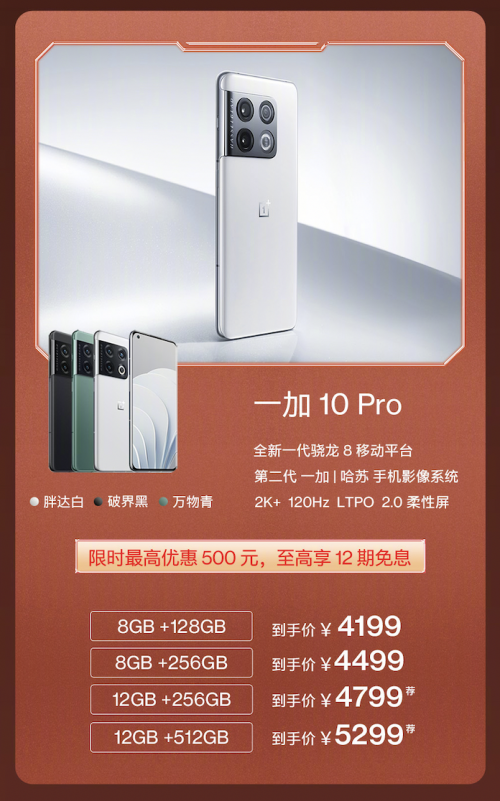 性能、游戏、充电、屏幕等全面拉满的第十代性能旗舰一加10Pro,搭载骁龙8旗舰芯,第二代一加|哈苏手机影像系统,2K+120HzLTPO2.0柔性屏,全系产品劲爆直降,限时最高优惠500元,更可享长达12个月的免息优惠,到手价4199元起。