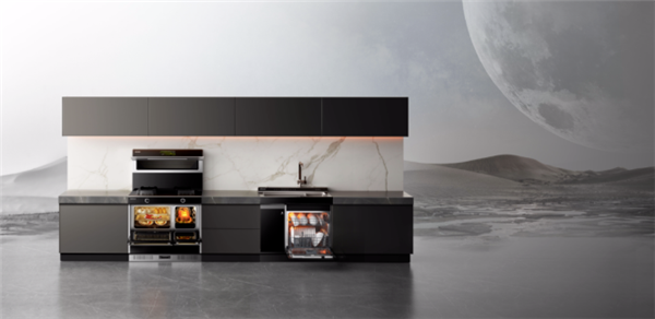 横向上,以集“烟、灶、蒸、烤、空气炸”为一体的蒸烤独立集成灶,以及集“水槽、洗碗、果蔬清洗、厨余处理、加热烘干”等于一体的集成水槽洗碗机,组成一平米的洗切烹动线;纵向上,以烟机-灶具-蒸-烤-空气炸,以及水槽-果蔬清洗-洗碗-厨余处理-烘干,形成固定一个点上便可实现『智能烹饪+鲜蔬餐具洗』动线;通过数据协同实现跨品类的互联互通,以言屏双控实现功能启动与操作,在智能生态下让厨房生活更加条理、便捷、高效,引领“无人厨房”时代。