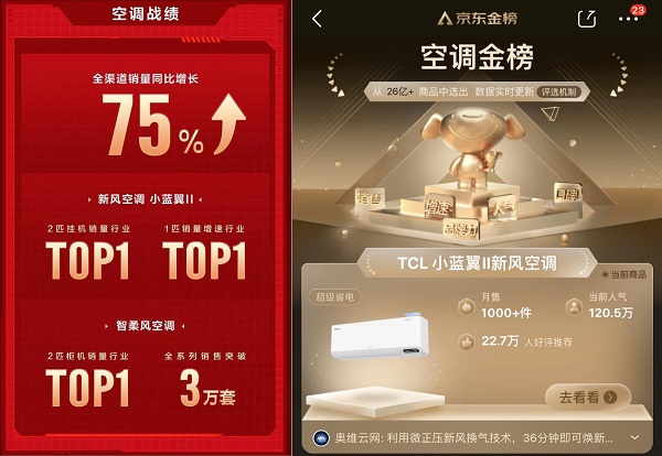 自去年11月30日上市以来,TCL新风空调小蓝翼II销量一路开挂,据数据显示,去年12月8日京东平台开售当天,首发零售量突破1000套,单品浏览人次突破200万,斩获京东新风空调品类销售额、销售量、流量三冠王。