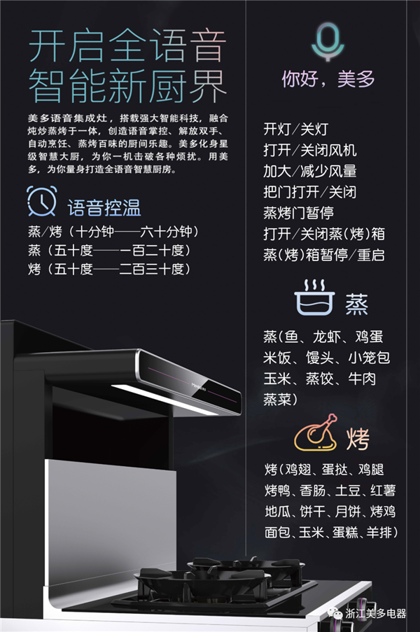 使用美多集成灶在燃气灶点火瞬间,油烟机便能自动开启,关闭燃气灶时烟机还能延迟进行关闭。一开一关,残留的油烟能够完全的被吸净,智能化的操作也可以让下厨更加的轻松,像美多语音集成灶和科大讯飞强强联合,厨房操作只需一声“你好,美多,打开烟机”、“关闭烟机”、“加大风量”等语音指令,便会根据你的指令自动运行!