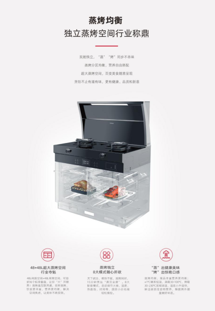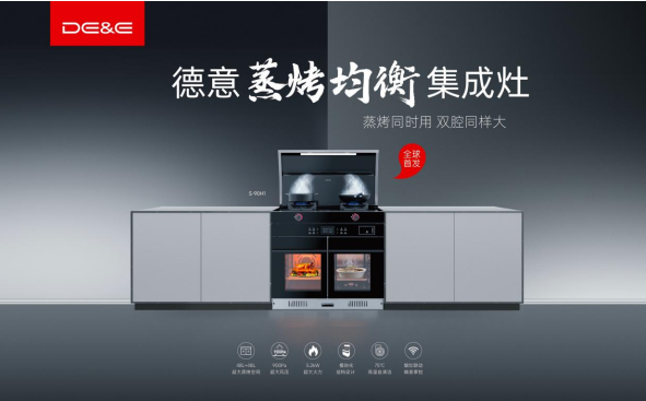 德意电器一直以来都拥有敏锐的市场洞察力,坚持不断推陈出新,完善产品矩阵,除了提升产品品质、创新技术、提升品牌声量外,还注重消费者不断升级的消费需求。自2020年开行业先河、推出革命性意义的模块化集成灶——三𡘙系列,斩获行业及市场的双双肯定之后,德意凭借自身强大的研发力,再一次推出了自主研发全新的蒸烤均衡集成灶。蒸烤同时用,双腔同样大,以48L+48L超大纯蒸单烤空间问鼎行业之颠,也再一次重新定义了蒸烤集成灶。