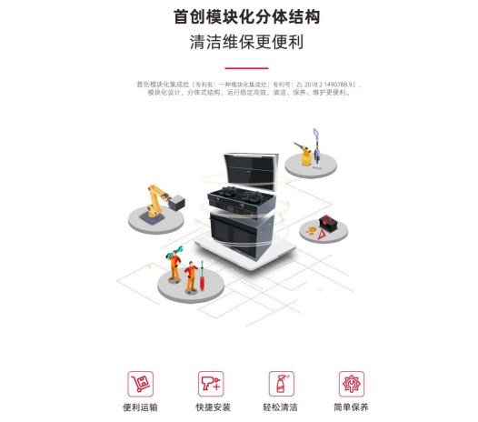 自三𡘙系列集成灶开始,德意电器跨入了模块化时代。凭借首创的模块化集成灶(专利名:一种模块化集成灶;专利号:ZL201821490788.9),德意电器牢牢在集成灶市场占据了头部位置,也创新升级了厨房烹饪新体验。