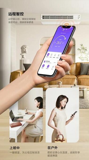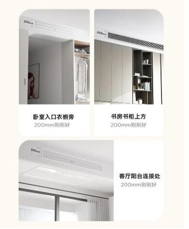 在现在市场中就有不少纤薄出挑的优质中央空调。以美的乐享II家用中央空调为例,其内机机身仅高20mm,局部吊顶完成高度仅需230mm,吊顶进深仅需600mm,如此小尺寸意味着可以释放更多的吊顶空间,轻松安置在卧室入口、书房书柜上方以及客厅阳台连接处,精致小巧的设计风格更能够驾驭多种空间风格。