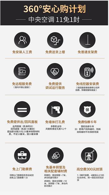 因此,在选择中央空调时可以优先考虑大品牌产品,比如国民品牌美的就为中央空调消费者提供了360°安心购权益,涵盖中央空调服务的12项内容,并拥有从安装资质、安装材料、安装工艺及后期验收等一系列完备的安装操作规范,每一个环节都能做到让消费者省心省力,并提供长达6年的整机质保。