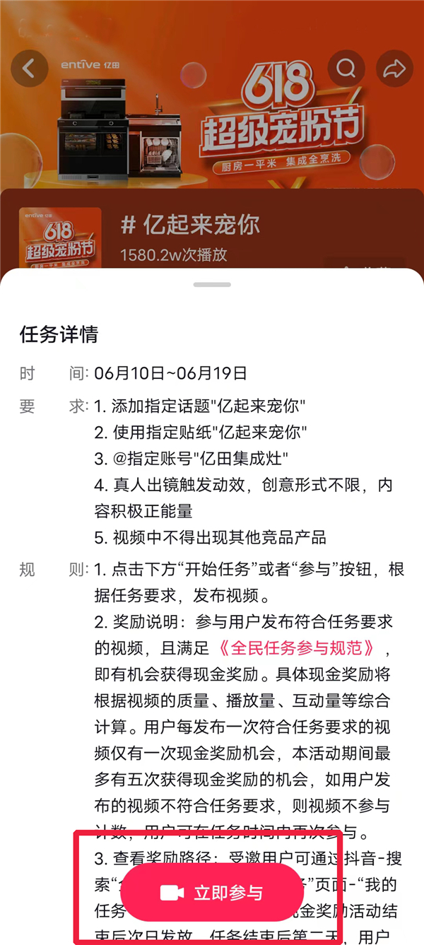 无需繁琐的操作,也没有高度限定的门槛。亿田抖音618,「亿起来宠你」,简单两步,即可轻松参赛!