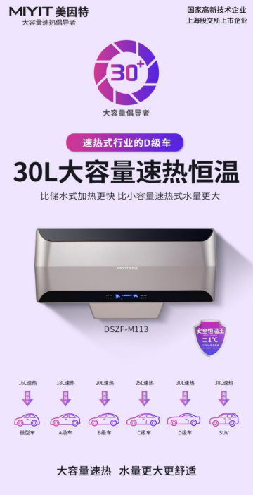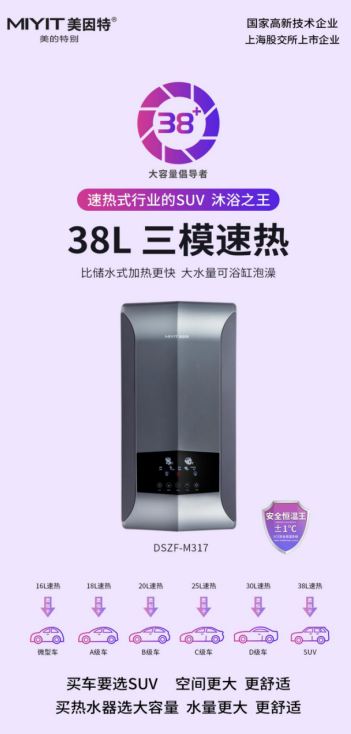 30升大容量速热产品上市以后,因为水量足够、稳定性好,用户满意度极高,大容量速热产品也慢慢成为了代理商与用户们的首选。2021年,美因特又推出38升大容量速热,这是一款可以洗浴缸的速热产品,是行业内真正的沐浴之王。
