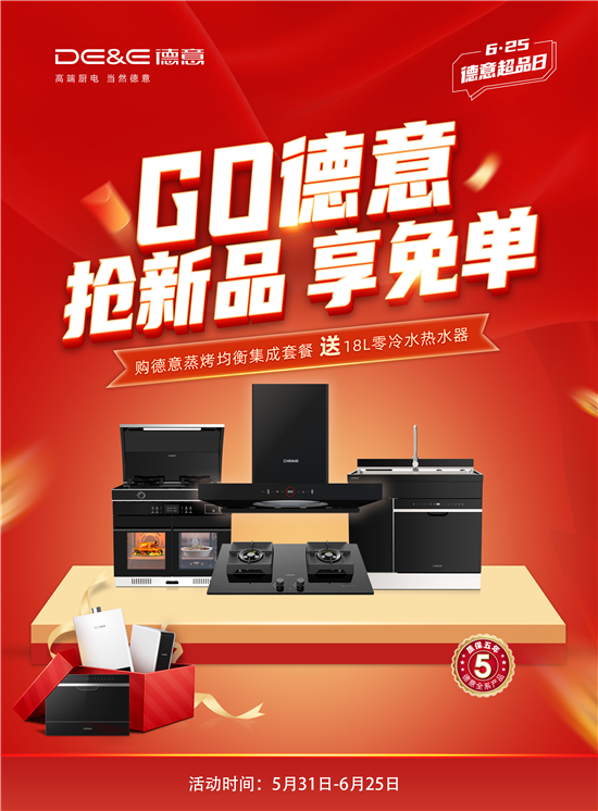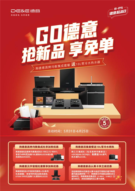 本次活动以“GO德意抢新品享免单“为主题,活动时间从5月31日至6月25日,以2022年推出的两大新品“蒸烤均衡集成灶/○宇宙大风压油烟机”为核心,整合一切资源,全员动销,并通过王炸福利,全力引爆品牌在全国范围内的消费热潮。