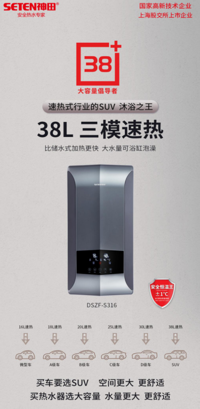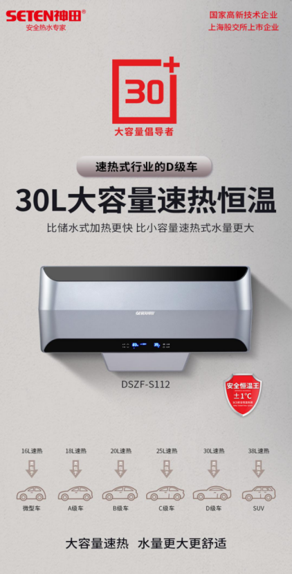2020年,神田上市的30升大容量速热S112,体积小,加热快,水量比小容量速热充沛,在冬天的时候也能满足用户沐浴的要求。大容量的设计理念,解决了小容量速热冬天热水不够用的弊端。
