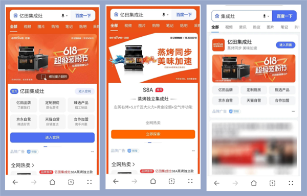 急速搜索,品牌直达!亿田深度布局手机APP、PC双端百度SEM资源,输入【集成灶】、【亿田集成灶】等行业、品牌关键词,即可以更为精准的内容推送,让用户可第一时间在搜索结果页面以首页首位推荐、超大屏广宣形式触及亿田!