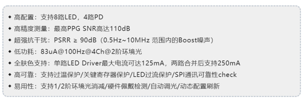 经实测数据显示,CS1262芯片的关键性能指标达到业界一流水平,可以与主流AFE设计兼容,能够为用户提供高配置、高精度测量、超强抗干扰、低功耗、全肤色支持、高可靠及易用性等七大核心价值。