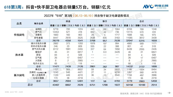 奥维云网发布了抖音快手618促销期的市场快报,快报显示,抖音+快手厨卫电器总销量5万台,销售额超过1亿元。