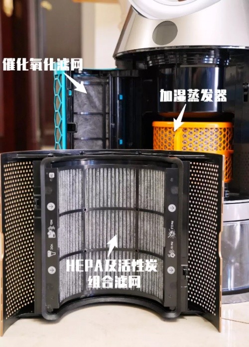 ▼中间的催化氧化滤网就是戴森加湿空气净化风扇PH04这款产品上最重要的“黑科技”之一了。