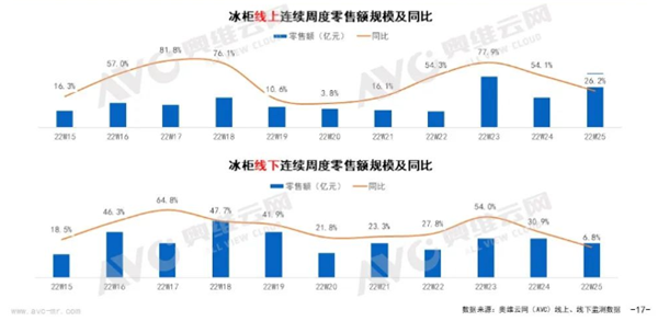 在冷柜销售刚刚爆发之时,热销现象被认为是疫情之下的应激消费,但随着常态化疫情防控、预制菜等储存要求则让消费者对于冷冻存储的需求发生变化,从而对冷冻空间有了更高需求。奥维云网监测数据显示,从2022年第15周开始一直到第25周,冷柜线上市场一直保持增长,618促销期线上冷柜市场零售额同比增长26.2%,线下市场零售额同比增长6.8%。