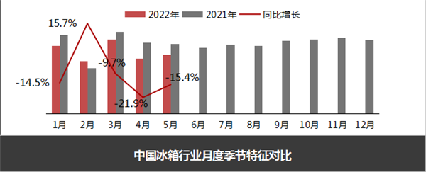 1-5月冰箱总产量为3136.2万台,同比下降11.1%;总销量为3240.7万台,同比下降8.9%;总出口量为1629.3万台,同比下降10.9%;总内销量为1611.4万条,同比下降6.8%。