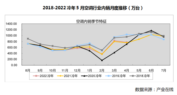 对比终端销售数据的惨淡,供货端产销情况保持相对平稳。从2022年1-5月累计产销数据来看,生产累计7029.30万台,同比下降1.33%;销售累计7070.83万台,同比增长1.2%,其中出口3586.35万台,同比增长0.71%,内销出货3483.38万台,同比增长1.71%。随着空调传统销售旺季的来临,叠加气温攀升、疫情稳定带来的利好,供货端的产销情况保持着相对稳定的节奏,但供货端对市场的态度依旧谨慎悲观。