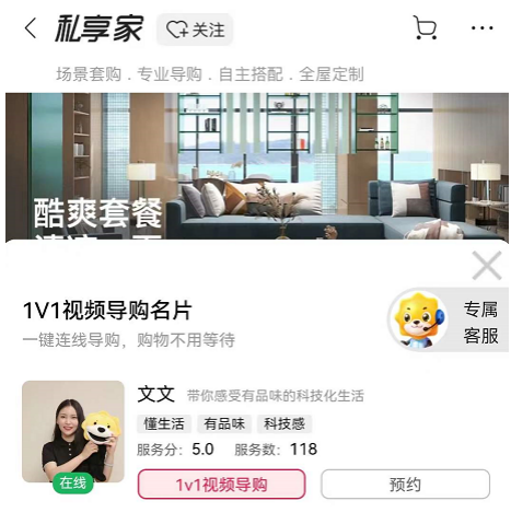 当然,3D样板间仍在不断丰富中,并未收录所有装修类型,与1对1定制尚有差距。为了补完服务,“私享家”增加了视频导购,可以做到1V1专业定制服务。用户可在与直播间的专业导购员连线,导购员通过视频给出个性化解决方案。