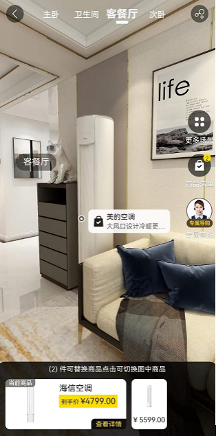 据“私享家”负责人介绍,这是一款基于“家场景”的服务产品。消费者进入“私享家”界面后,可以根据自家不同的装修风格,选择不同线上3D样板间。比如简洁的北欧风、复古的新中式、轻奢的欧式、原木的日式......样板间中有苏宁专业导购设计好的家电套购方案,消费者身临其境,沉浸式选购整屋家电。