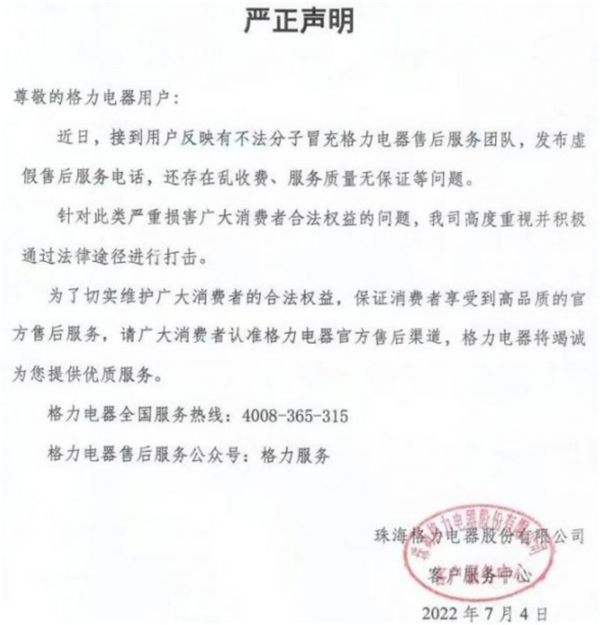 格力电器声明:有人冒充格力售后,将积极打击