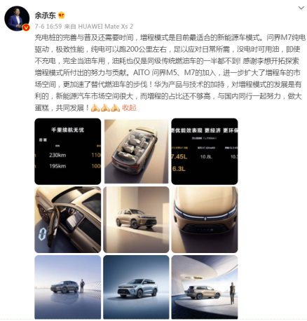 言论一出,顿时就登上了微博热搜,引发了网友热议,其实,早在7月6日,余承东就在微博表示,增程模式是目前最适合的新能源车模式,华为与赛力斯联合打造的问界M5和问界M7都采用了增程模式,通过发动机燃油发电的方式转换为动能,从而驱动汽车。