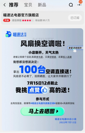 7月12日,喵速达电器旗舰店挂出公告,“天气太热,风扇换空调!晒出自家风扇图,点赞前100名,直接免费送,活动截止时间7月15号中午12点。”