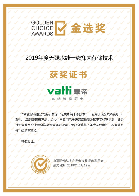 凭借对中国用户以及市场的敏锐洞察,华帝洗碗机突破行业“洗碗机洗后有污水残留”的技术瓶颈,积极创新技术,并在近期,华帝“巨能洗”系列洗碗机,配合使用finish亮碟洗碗机专用洗涤剂,通过了权威第三方检测机构中家院(北京)检测认证有限公司(以下简称“中家院”)的相关检测,获得了“洗碗机干态存储‘零残留水’和‘零残留洗涤剂’认证”证书。