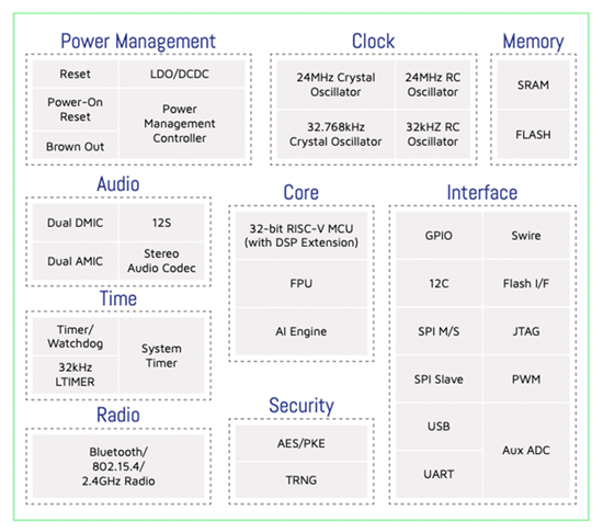 TLSR9系列SoC支持多种先进的IoT连接技术规范,包括经典蓝牙、蓝牙低功耗、蓝牙Mesh、Zigbee、Apple HomeKit、Apple Find My、Thread、Matter、2.4GHz专有协议及各类RTOS,且能实现部分多协议并行操作。该芯片内置了先进的32位RISC-V MCU,集成了DSP和浮点运算扩展指令,并搭载了独立的低功耗AI引擎对传感器和语音信号进行实时处理。TLSR9系列SoC现已获得Thread和PSA双重安全认证。自2021年中量产以来,TLSR9系列SoC已累计出货数百万片,被客户广泛应用于各类智能终端产品,包括无线音频设备、可穿戴设备、Apple Find My网络配件、智能医疗设备、智能遥控器、PC外设及众多其他低功耗AIoT设备。
