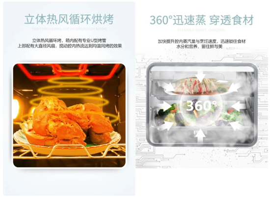 蒸,蒸出新滋味。美多采用了全新升级的循环蒸汽加热技术,能够将水迅速气化成水蒸气,蒸汽通过食品级硅胶管进入蒸烤箱内部并充分包裹住食材,肌理被热蒸汽蒸熟蒸透,展现出食材最鲜嫩可口的一面。