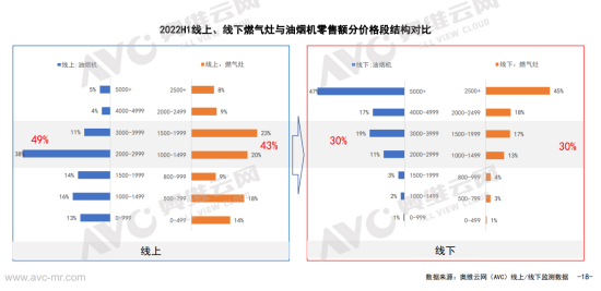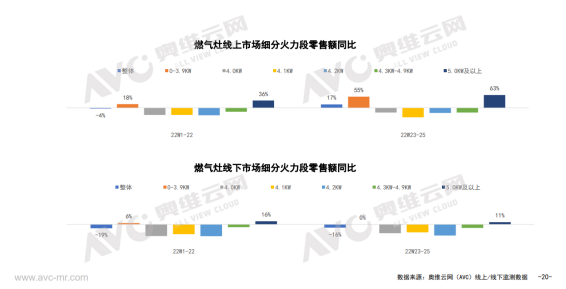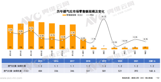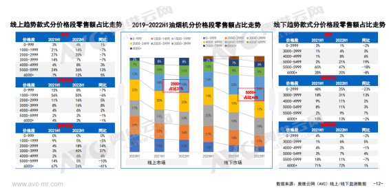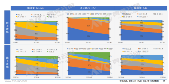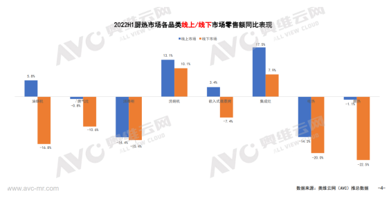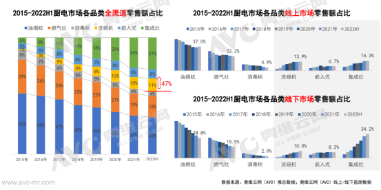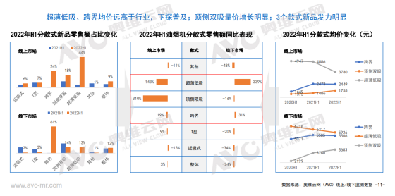 正是如此,我们看到了近几年油烟机行业的升维之路。来自奥维运网(AVC)推总数据显示,尽管2022年1-6月份油烟机零售量892万台,同比-14.5%,零售额144亿元,同比-8.6%,但是超薄低吸烟机、跨界烟机、顶侧双吸烟机表现不错,其中超薄低吸烟机1-6月在线上市场零售额同比增长了143%,线下市场同比增长了339%;跨界烟机线上线下同比分别增长了19%和31%;顶侧双吸烟机则在线上市场同比爆增310%,线下市场则同比下滑了16个百分点。