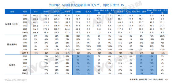 根据奥维云网(AVC)地产大数据显示,2022年1-5月,商品住宅精装开盘项目总计676个,同比-45.4%,精装规模50.3万套,同比-52.1%。