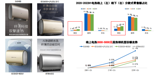 电热产品中,颜值当道,薄型机强势占领3500-5000元高端市场。薄型产品线上占比提升至9.2%,线下占比提升至25.4%,上升趋势显著。例如史密斯E60HGD市场份额占比0.14%,深受消费者的青睐。