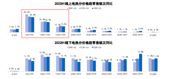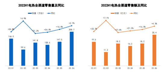 据奥维云网(AVC)推总数据显示,2022年上半年电热零售量881万台,同比下滑18.4%,零售额107亿元,同比下滑17.1%;燃热零售量559万台,同比下滑13.1%,零售额116亿元,同比下滑14.2%。