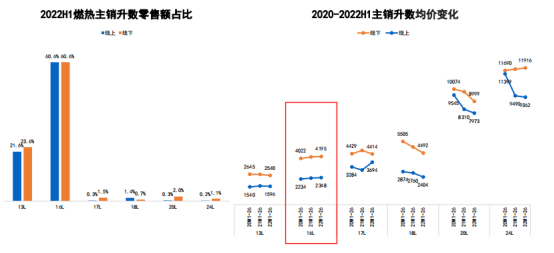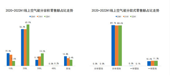 2022年上半年,空气能热水器由于核心结构复杂,均价长期处于高位。线上均价5969元,线下均价7690元。容积依然是200L为主流,占比六成,同时,300L增长明显,占比已提升至19.2%。