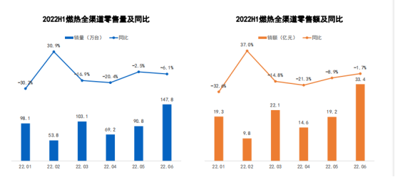 燃热上半年和电热走势相同,唯有二月呈现增长趋势,零售量53.8万台,同比增长30.9%,零售额9.8亿元,同比增长37.0%。其余月份均受疫情影响,6月因为618年中购物节,零售量147.8万台,同比下滑6.1%,零售额33.4亿元,同比下滑1.7%。相比起电热的大幅下滑,燃热市场表现略好。