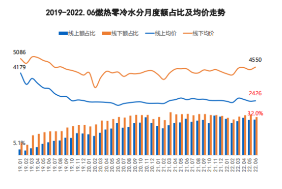 其实,从618数据就能看出,抖音快手等新兴电商渠道规模处于成长期,产品结构表现优于预期。据奥维云网(AVC)抖音渠道监测数据显示,2022年1-6月热水器合计零售量17.2万台,零售额1.7亿元,其中燃热占4.9万台,1.1亿元,均价2273元。