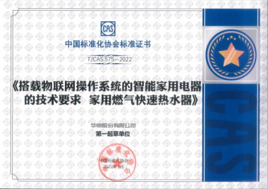 3月,中国标准化协会正式批准发布了由华帝牵头,联合华为、中家院(北京)检测认证有限公司、中国家用电器研究院、共同制定的行业首部《搭载物联网操作系统的智能家用电器技术要求家用燃气快速热水器》标准。