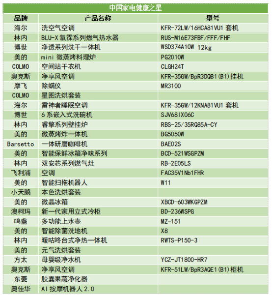 同时,28款年度热销健康家电产品(详见下表)通过层层选拔脱颖而出,成为2022年度“中国家电健康之星”。据了解,本次“健康之星”年度大奖评选共收到来自数十家企业报送的百余件具有健康功能的产品。《电器》杂志社组织专家,从产品健康性能、技术特点、设计理念及应用状况等进行评审,最终28款产品因在产品性能、技术特点、设计理念、应用场景上紧扣“健康”发展趋势,满足消费者健康需求,推动家电市场消费升级,成为如今中国家电市场上最具代表性的健康家电产品。